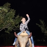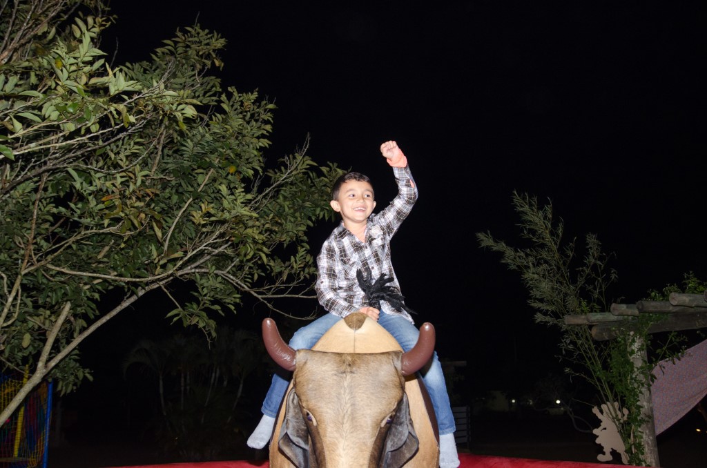 As crianças brincaram a noite toda com brinquedos infláveis, cama elástica e touro mecânico; os adultos não deixaram por menos e também se divertiram muito com a animada quadrilha.