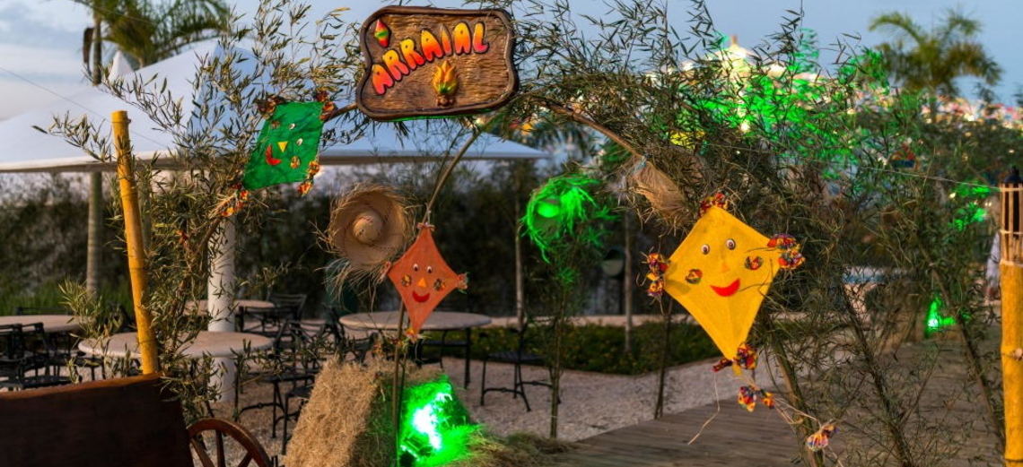 Um atraente caminho de arcos de bambu conduziu todos até o centro do divertido "arraiá". No alto, um festão de bandeirinhas, formando uma espécie de telhado colorido, enchia os olhos.