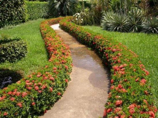 A ixora também é muito utilizada como cerca viva e fica exuberante quando plantada isoladamente como arbusto. Produz flores cor de coral, amarelas, vermelhas, brancas e rosadas.
