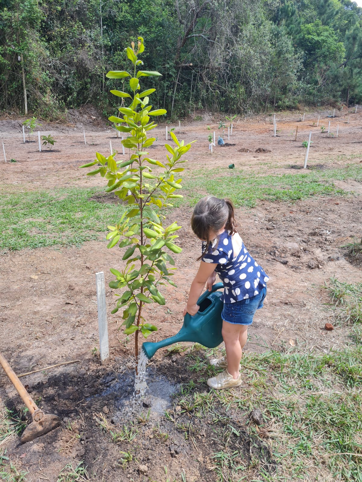 O preparo do terreno e o plantio das mudas teve a colaboração de integrantes das equipes de manutenção do empreendimento, e a primeira rega, foi realizada pelas crianças presentes.