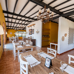 “Mesas de madeira maciça e cadeiras foram escolhidas para oferecer conforto e aconchego. Os tijolos pintados de branco adicionam um toque de leveza e amplitude ao ambiente”.