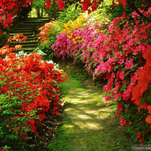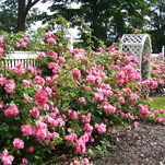 Uma bela roseira em tons de rosa, alternando entre claro e escuro, formando as nuances, com magnólia, petúnia, gerânio e onze horas.
