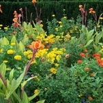 Crisântemo, lírio, lantana amarela rasteira e tagete. Você pode mesclar com alguns crótons que tem folhagens amarelas e verdes.
